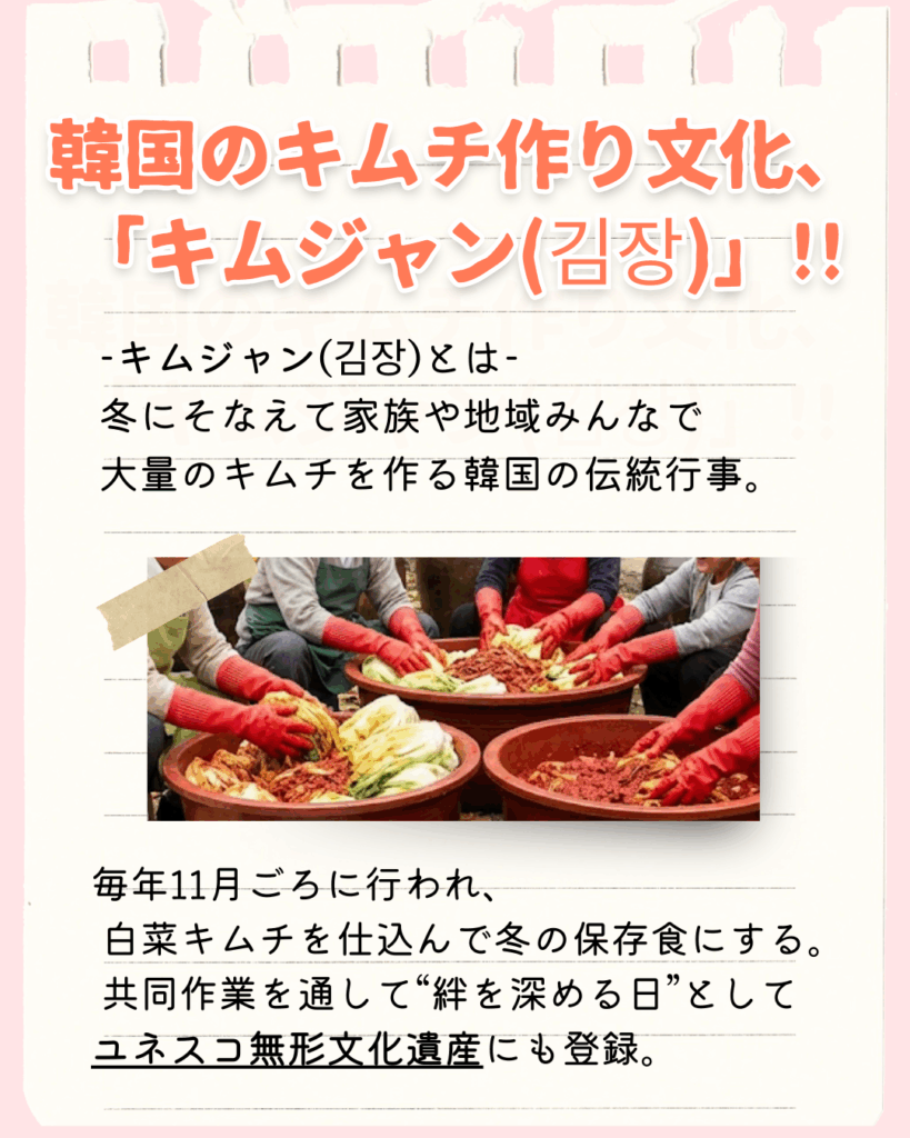 キムジャンとは、冬に備えて家族や地域の人々が集まり、大量のキムチを仕込む韓国の伝統行事で、現在はユネスコ無形文化遺産にも登録されています。