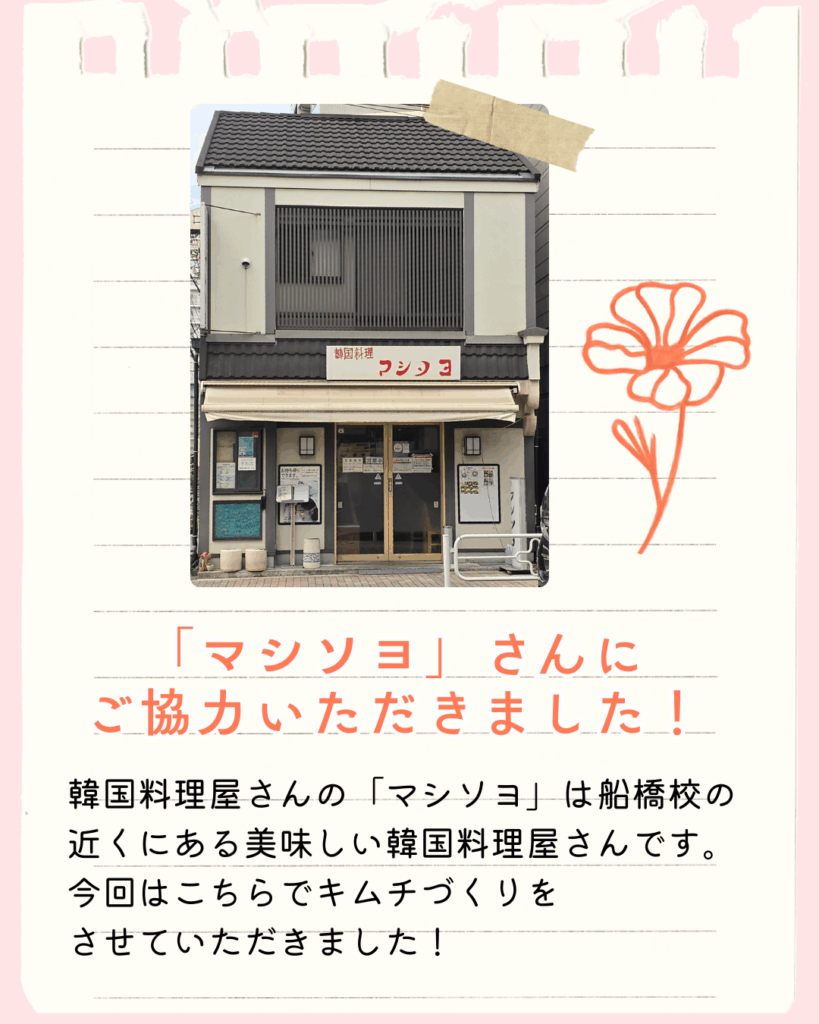 当日は、船橋校近くの韓国料理店「マシソヨ」さんにご協力いただき、店主さんから直接、キムチの作り方を教えていただきました。
