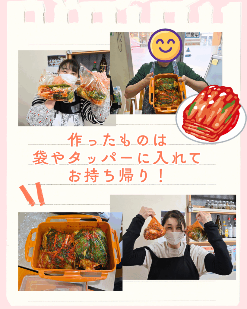 完成したキムチは、それぞれ袋やタッパーに入れてお持ち帰り。おうちでの熟成や、食べ頃を待つ時間も含めて、キムジャン文化を体験していただけたのではないかと思います。