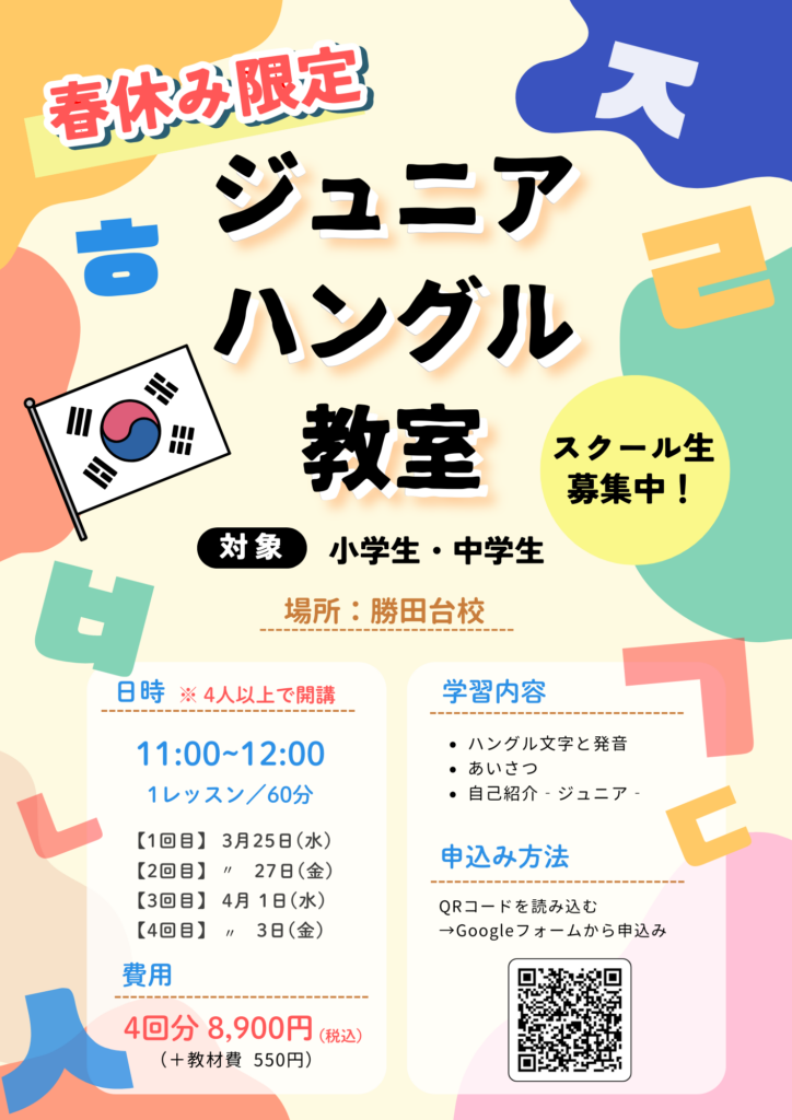 【春休み限定】ジュニアハングル教室 生徒募集中