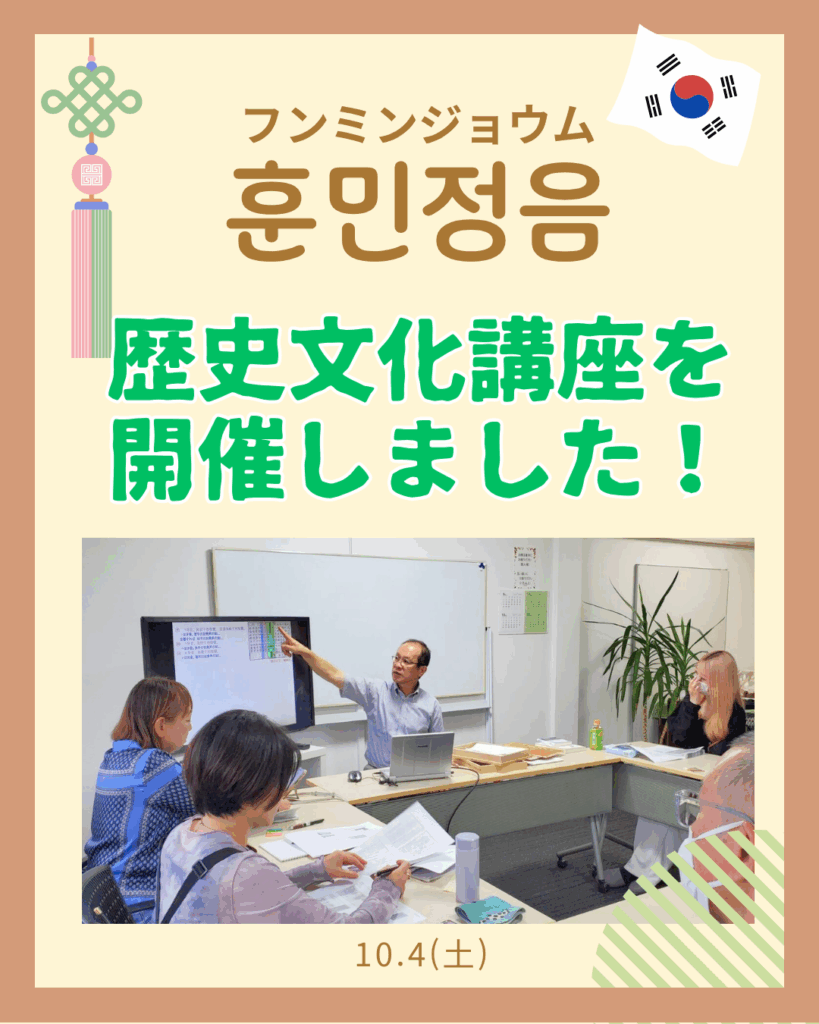 10月の文化講座では、ハングルの誕生とその背景をテーマに「訓民正音(フンミンジョウム)」について学びました📖 講師は当学院の郭喜碩先生。朝鮮王朝時代の世宗大王がどのようにハングルを作ったのか、その歴史的背景や造音の秘密まで、分かりやすく丁寧に解説していただきました🎓